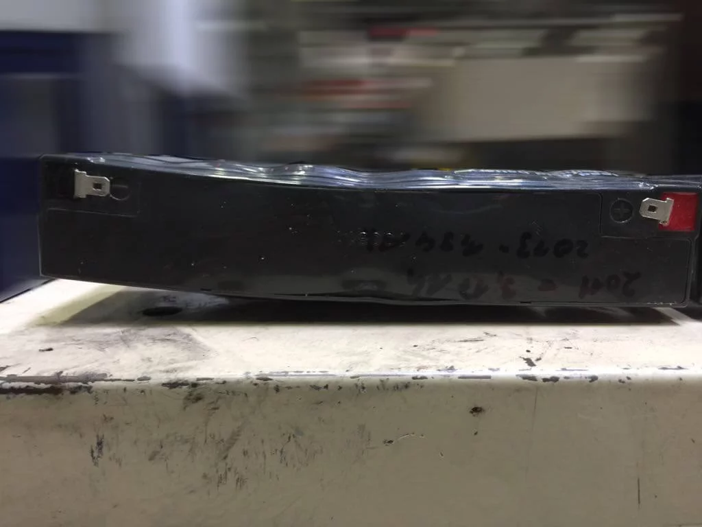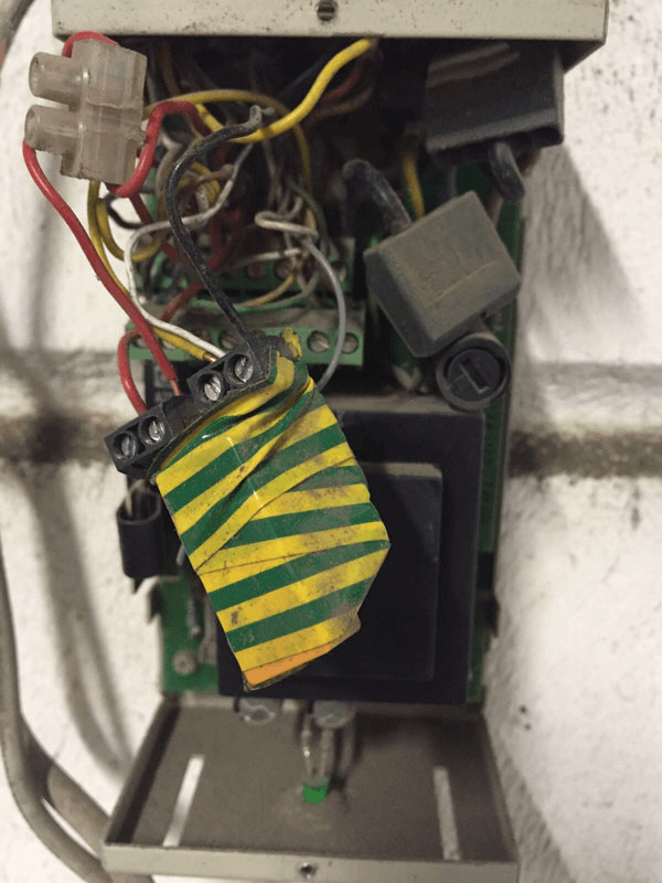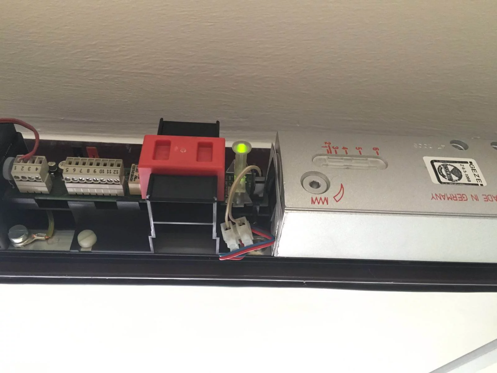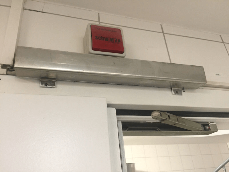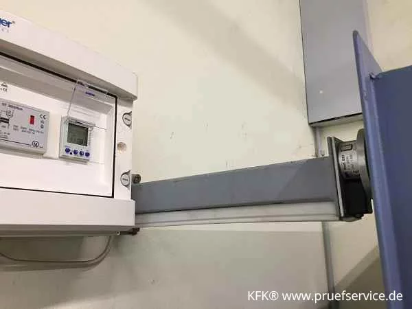 Prüfung und Wartung von Feuerabschlüssen, Brandschutztoren, Brandschutztüren und Feststellanlagen, hier war der Rauchschalter an der Decke falsch positioniert, nicht nach DIBT. (Bei Rauch würde der Rauchschalter wegen der falschen Montage erst verzögert auslösen)